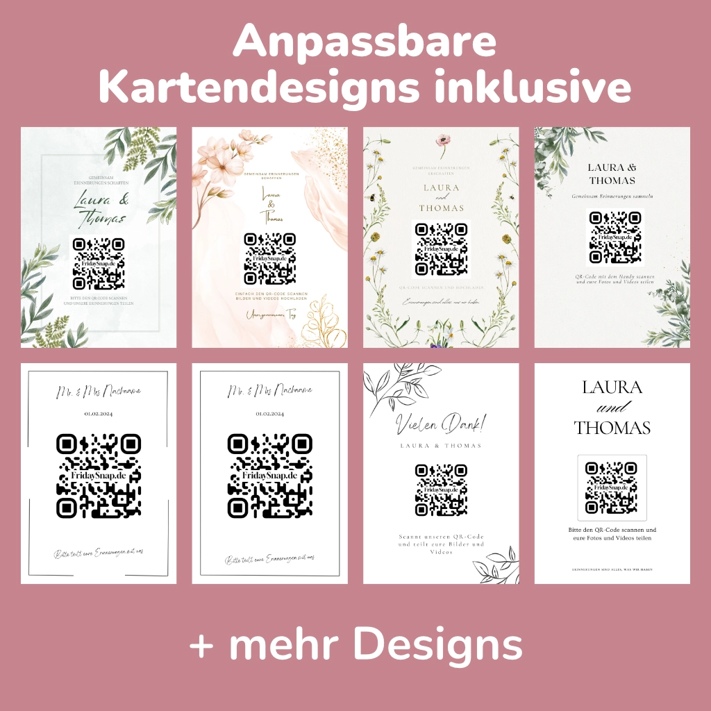 Wir haben für euch personalisierbare Kartendesigns erstellt, damit ihr euren Hochzeits QR-Code euren Gästen wunderschön präsentieren könnt. Damit motiviert ihr eure Gäste, Fotos zu sammeln und mit euch zu teilen.