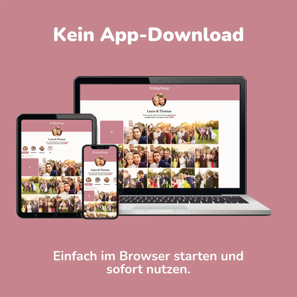Mit deinem personalisierten Link findest du sofort alle Bilder und Videos deiner Gäste in einer Online-Galerie: Ansehen, Teilen und Downloaden – für immer!