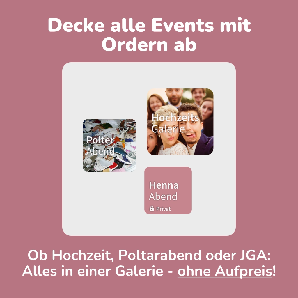 Die Rechte an deinen Fotos und Videos bleiben selbstverständlich bei dir und werden niemals von uns oder dritten verwertet. Der einzige Zugriff auf deine Bilder erfolgt über deinen Galerie-Link bzw. QR-Code.